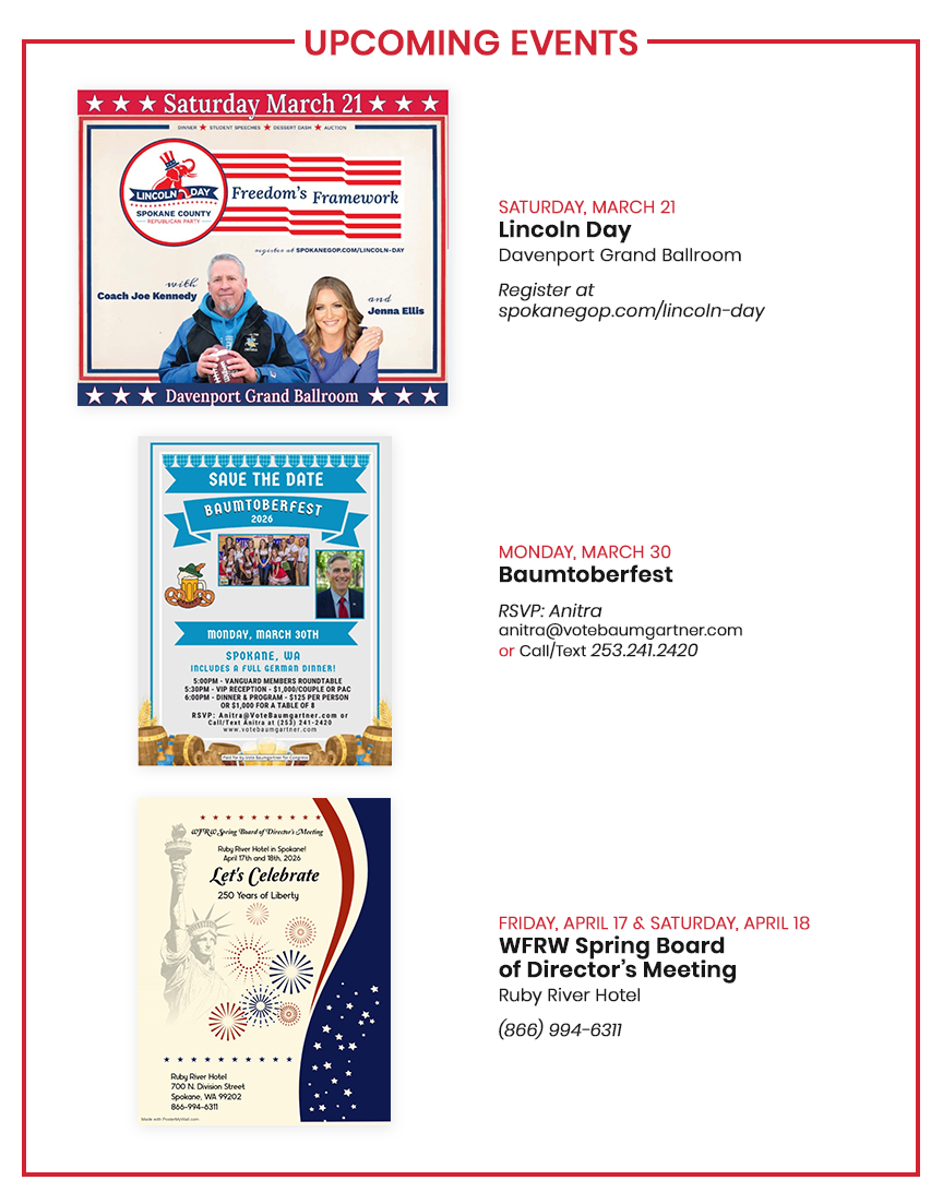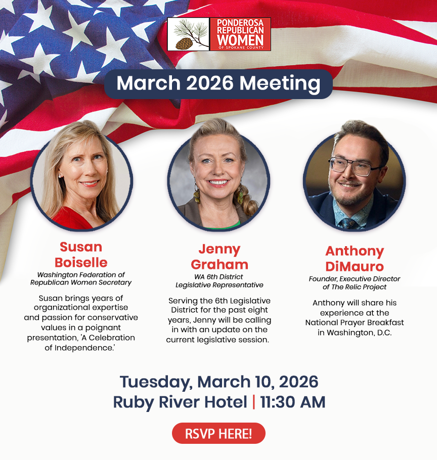📣 You're Invited to the March 2026 Meeting! This month, Susan Boiselle, WFRW Secretary, will present 'A Celebration of Independence,' Jenny Graham, WA 6th District Legislative Representative, will be calling in to give a legislative update and Anthony DiMauro will share his experience of attending the National Prayer Breakfast in Washington, D.C. 📅 Date: Tuesday, March 10, 2026 🔔 RSVP Deadline: Tuesday, March 3, 2026 Space is limited — reserve your seat early! We look forward to seeing you there! |